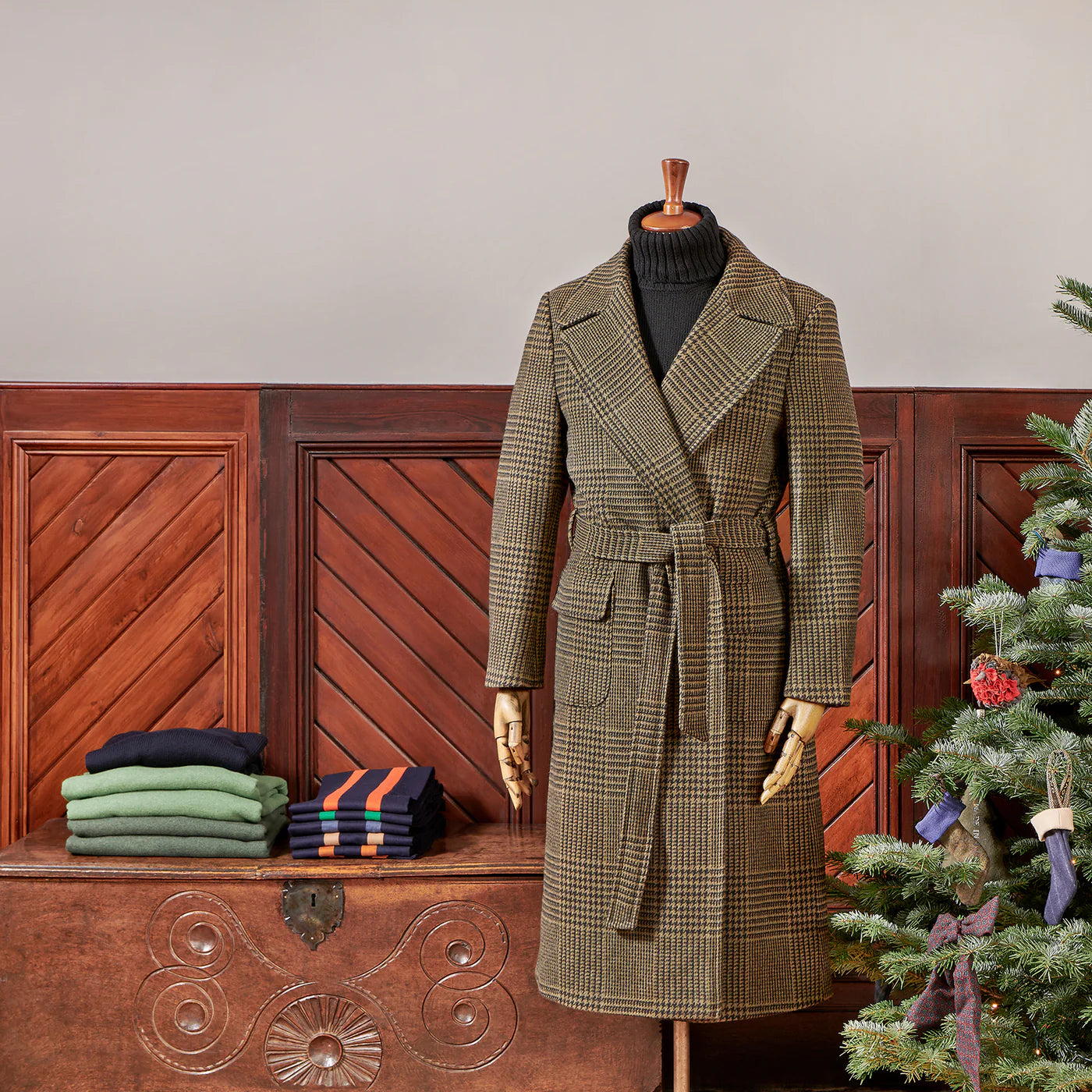 Gowns for wearing as coats; thicker materials, lined, but still with our trademark comfortable slouchy look and feel. These Outer Gowns are based on a hybrid of our lounge gowns and the sort of Polo Coat that would have been thrown on between chukkas a century ago.